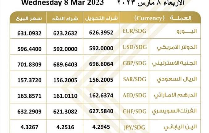 اخبار اسعار العملات الأجنبية مقابل الجنية السوداني ليوم الأربعاء بواسطة انغام الحرية آخر تحديث مارس 8, 2023 0 شارك اسعار العملات الأجنبية مقابل الجنية السوداني ليوم الأربعاء الثامن من شهر مارس وتفاوت أسعار الدولار في البنوك السودانية 0 شارك